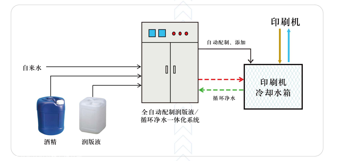 潤版液凈水過濾系統(tǒng),潤版液濃縮液、酒精(IPA)、自來水按一定的分量比例配置,混合后加到冷卻箱內(nèi),比起PH值管理或電導(dǎo)率管理的配置方式潤版液濃度更精.準(zhǔn)、穩(wěn)定??蛇x擇加酒精和免酒精。