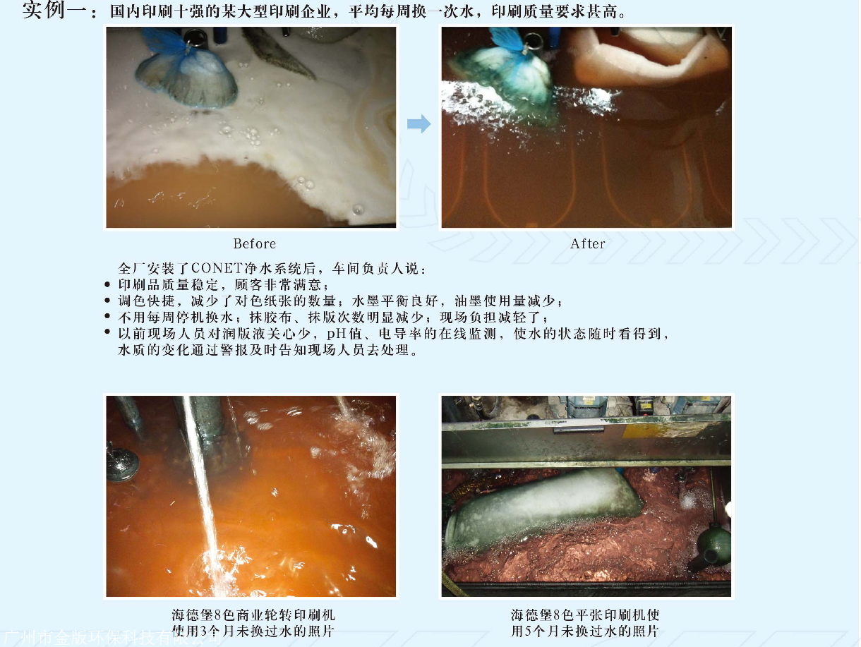 凈水系統(tǒng)采用非加壓式的自然循環(huán)方式,使用及維護都非常簡單,適用于任.何膠印機、海德堡、羅蘭、小森、三菱貨國產(chǎn)印刷機。初期投資及維護成本都非常低廉、合理,易為印刷廠所能接受。